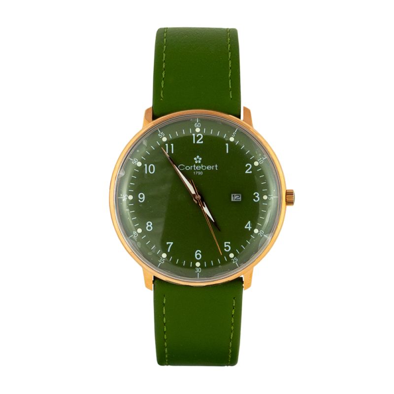 Стилен мъжки часовник Cortebert. Моделът е с корпус от неръждаема стомана и каишка от естествена кожа. Зелен аналогов дисплей с показател за дата. Стъкло минерал-кристал. Задвижва се от кварцов механизъм. Водоустойчивост 3 ATM - допускат се леки пръски, не се препоръчва обилно мокрене.