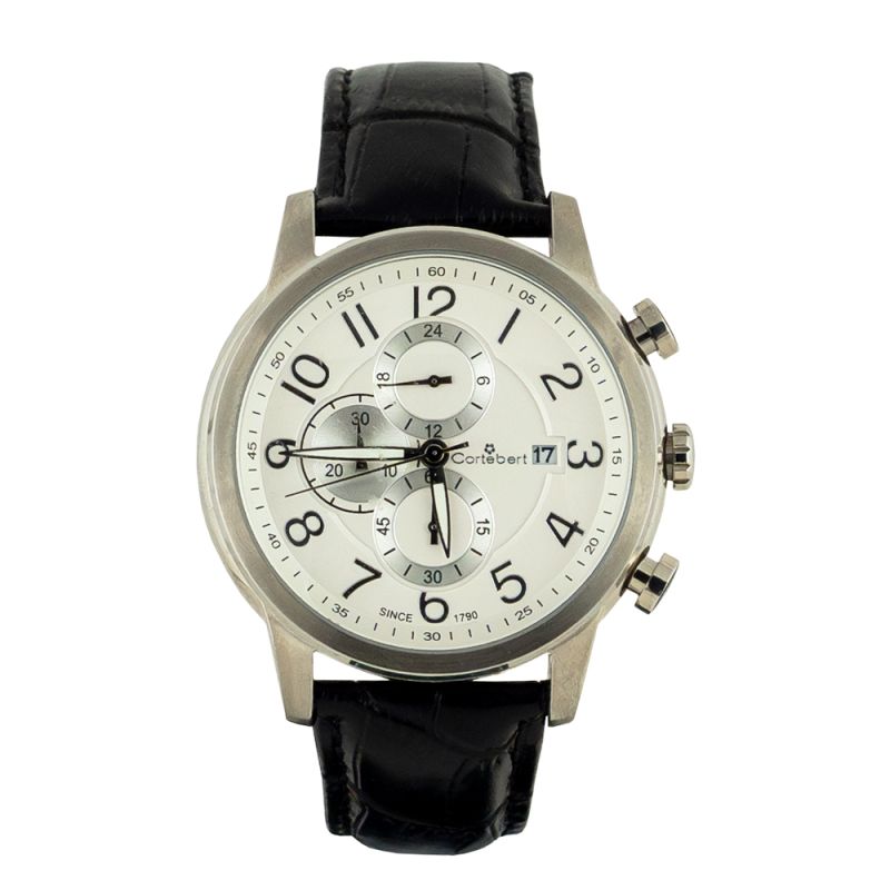 Мъжки часовник Cortebert със стилна визия. Корпус изработен от неръждаема стомана. Черна каишка от естествена кожа. Бял дисплей тип хронограф с луминисцентни стрелки и сребристи детайли. Стъкло минерал-кристал. Задвижва се от кварцов механизъм. Водоустойчивост 3 ATM - допускат се леки пръски, не се препоръчва обилно мокрене.