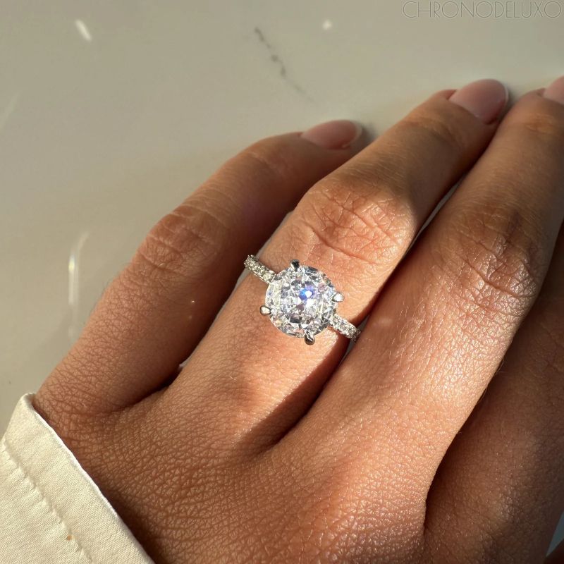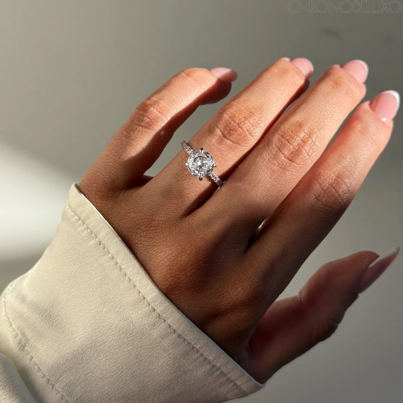 Централният камък с прецизна кръгла шлифовка излъчва интензивен блясък, подчертан от фино изработена лента, която допълнително улавя и отразява светлината. Хармоничното съчетание между класика и съвременна естетика прави модела подходящ както за специални поводи, така и за елегантно ежедневие.