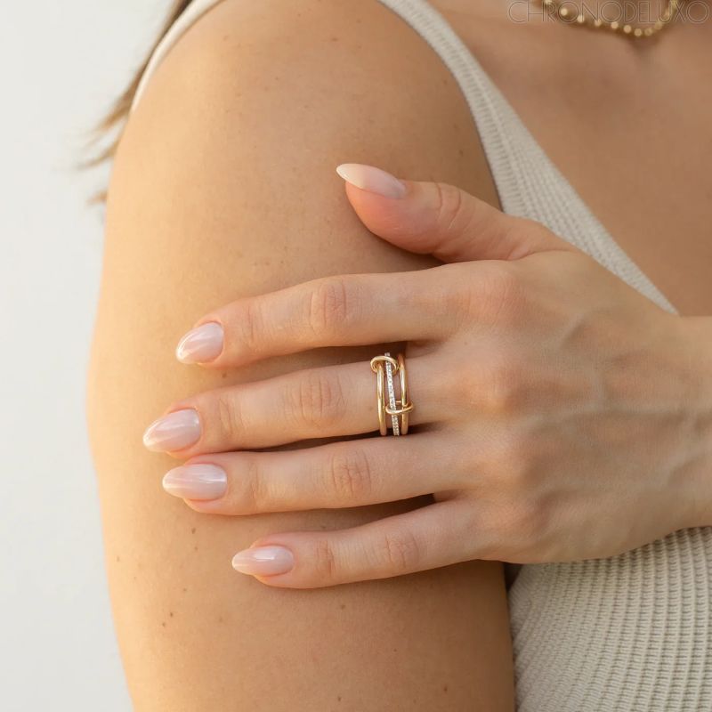 Централната лента е изцяло павирана с прецизно изрязани 5A кубични цирконии, които отразяват светлината с изключителен блясък – дори при деликатно осветление. Двете гладки странични ленти подчертават сиянието и придават баланс и стилна завършеност на дизайна.