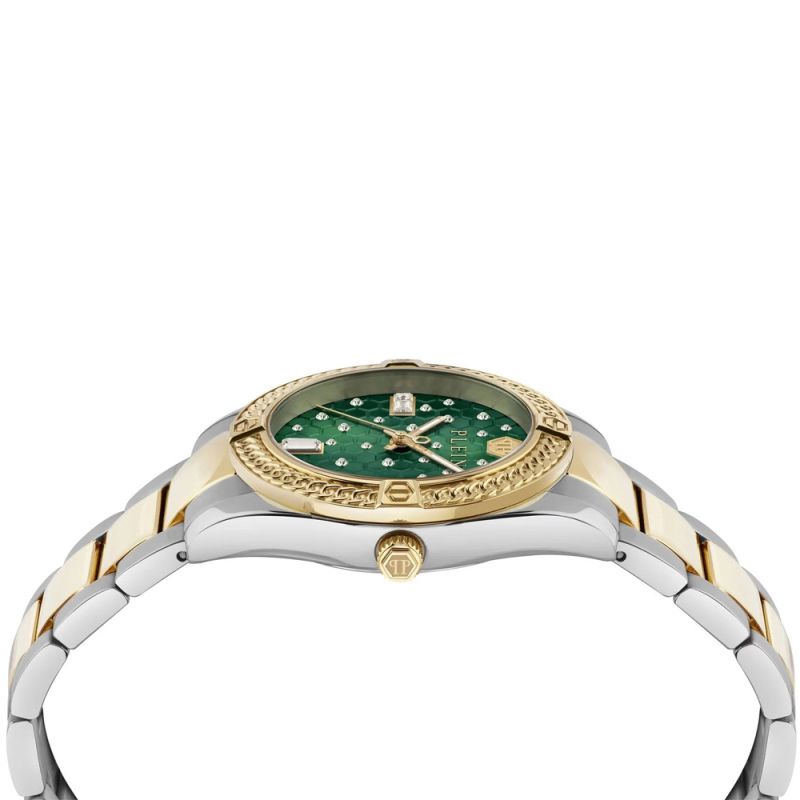 Дамски часовник Philipp Plein с нежна визия. Моделът е с корпус и верижка от неръждаема стомана и интересен дизайн тип плетка върху безела. Стъклото е минерал-кристал. Дисплеят е аналогов в зелен цвят със златисти акценти и декорация от кристали. Часовникът се задвижва от кварцов механизъм. Диаметър на корпуса 36 мм. Водоустойчивост 5 ATM - допускат се леки пръски и взимане на душ, не се препоръчва обилно мокрене.