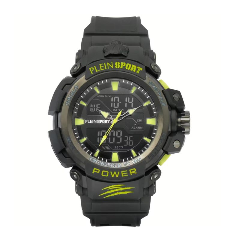 Спортен мъжки часовник Philipp Plein от колекцията Plein Sport. Дисплей комбинация от аналогов и дигитален. Луминисцентно покритие на стрелките и индексите. Минерално стъкло, устойчиво към надраскване. Пластмасов корпус, съчетан със силиконова каишка. Моделът има следните функции: 24-часов формат, аларма, хронометър и календар. Кварцов механизъм. Водоустойчивост 5 ATM - допускат се леки пръски и взимане на душ, не се препоръчва обилно мокрене.