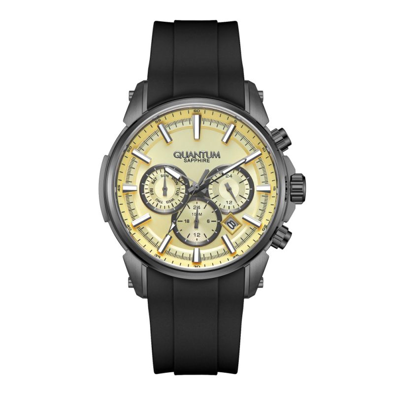 Страхотен модел мъжки часовник Quantum със спортно-ежедневна визия. Мултифункционален дисплей в златист цвят. Стъкло сапфир-кристал. Корпус от неръждаема стомана. Черна силиконова каишка. Диаметър на корпуса 41.5 мм. Часовникът се задвижва от кварцов механизъм. Водоустойчивост 10 ATM - позволява мокрене, къпане и плуване във водни басейни.