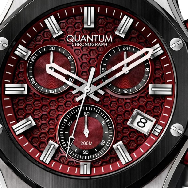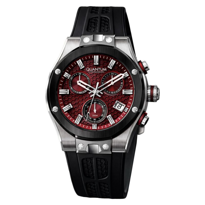 Спортен модел мъжки часовник Quantum от колекцията Hunter. Часовникът е с дисплей тип хронограф и стъкло сапфир-кристал. Корпус от неръждаема стомана в комбинация със силиконова каишка. Задвижва се от кварцов механизъм. Диаметър на корпуса 44 мм. Водоустойчивост 10 ATM - позволява мокрене, къпане и плуване във водни басейни.