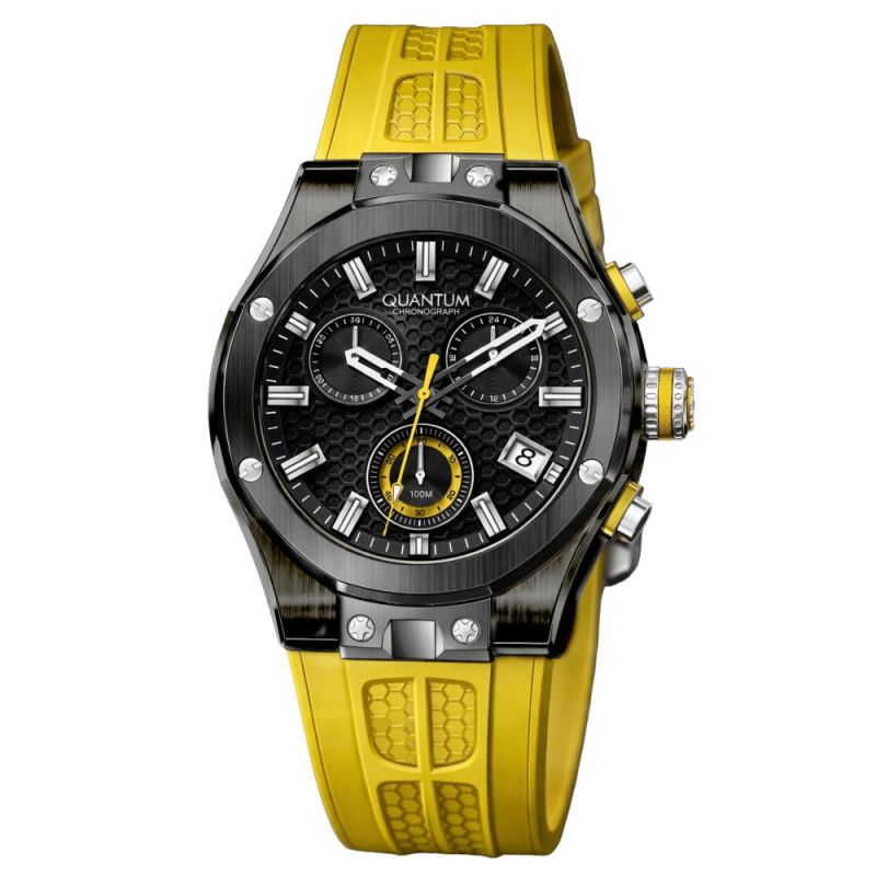 Спортен модел мъжки часовник Quantum от колекцията Hunter. Дисплей тип хронограф в черен цвят със сребристи детайли. Стъкло сапфир-кристал. Корпус от неръждаема стомана в комбинация със силиконова каишка. Задвижва се от кварцов механизъм. Диаметър на корпуса 44 мм. Водоустойчивост 10 ATM - позволява мокрене, къпане и плуване във водни басейни.