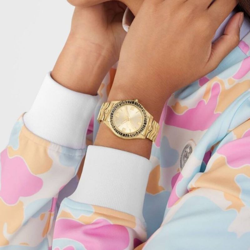 Впечатляващ модел дамски часовник Philipp Plein със спортно-елегантен дизайн от колекцията Plein Sport. Златист аналогов дисплей с елемент драскотини. Луминесцентно покритие на стрелките. Корпус и верижка изработени от неръждаема стомана. Стъкло минерал-кристал. Задвижва се от кварцов механизъм. Водоустойчивост 5 ATM - допускат се леки пръски и взимане на душ, не се препоръчва обилно мокрене.