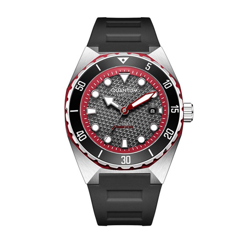 Мъжки часовник Quantum с корпус от неръждаема стомана и силиконова каишка. Стъкло сапфир-кристал. Аналогов дисплей с показател за дата и луминисцентно покритие на стрелките и индексите. Задвижва се от автоматичен механизъм. Водоустойчивост 20 ATM - позволява мокрене, къпане, плуване и гмуркане във водни басейни.