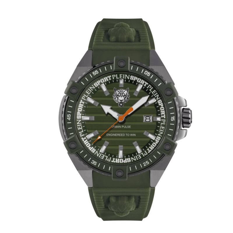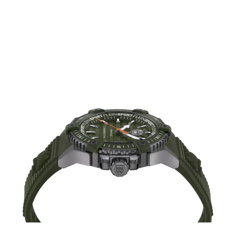 Мъжки часовник Philipp Plein с модерен спортен дизайн. Тъмнозелен аналогов дисплей с надпис „Engineered to Win“ и показател за дата. Луминесцентно покрите върху стрилките и индексите. Стъкло минерал-кристал. Корпус изработен от неръждаема стомана. Силиконова каишка с 3D тигрова глава. Диаметър на корпуса 47 мм. Задвижва се от кварцов механизъм. Водоустойчивост 5 ATM - допускат се леки пръски и взимане на душ, не се препоръчва обилно мокрене.