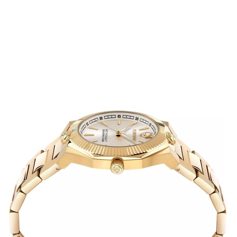Philipp Plein Sport Metronaut PSDGA0625 е впечатляващ дамски часовник. Златист аналогов дисплей с мотив глава на тигър. Стъкло минерал-кристал. Корпус и верижка изработени от неръждаема стомана. Диаметър на корпуса 36 мм. Задвижва се от кварцов механизъм. Водоустойчивост 5 ATM - допускат се леки пръски и взимане на душ, не се препоръчва обилно мокрене.