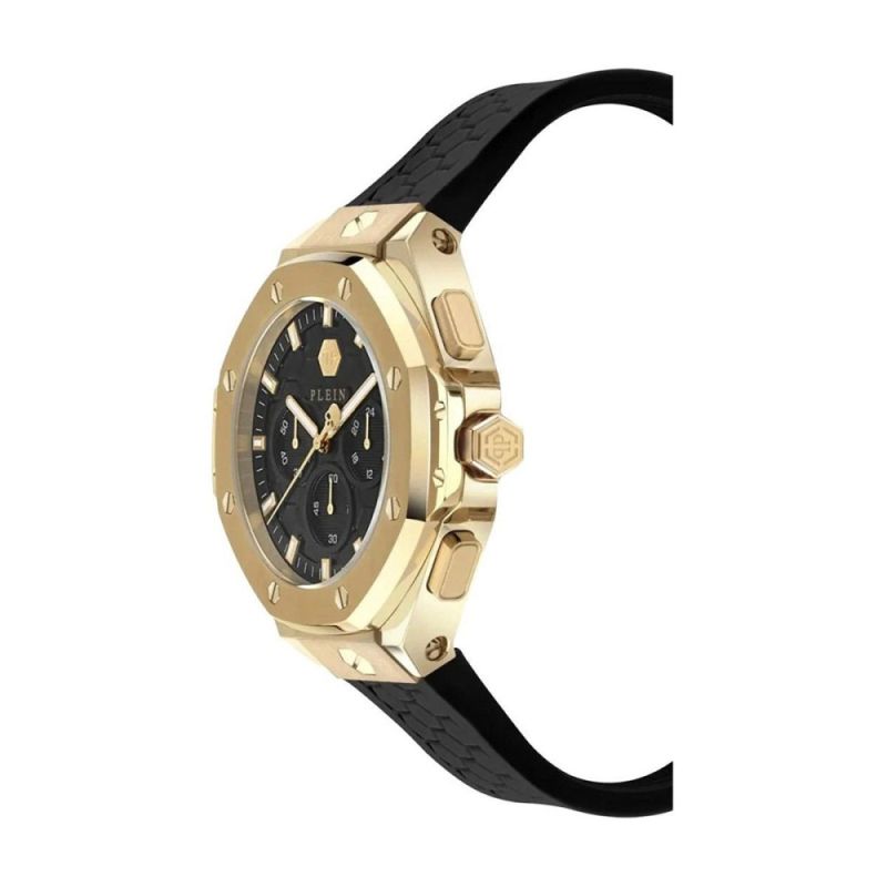 Унисекс часовник Philipp Plein със спортен дизайн. Черен дисплей хронограф със златисти детайли. Корпус от неръждаема стомана в комбинация със силиконова каишка. Стъкло минерал-кристал. Задвижва се от кварцов механизъм. Диаметър накорпуса 42 мм. Водоустойчивост 5 ATM - допускат се леки пръски и взимане на душ, не се препоръчва обилно мокрене.