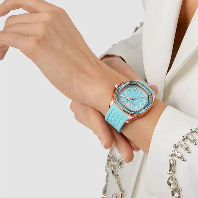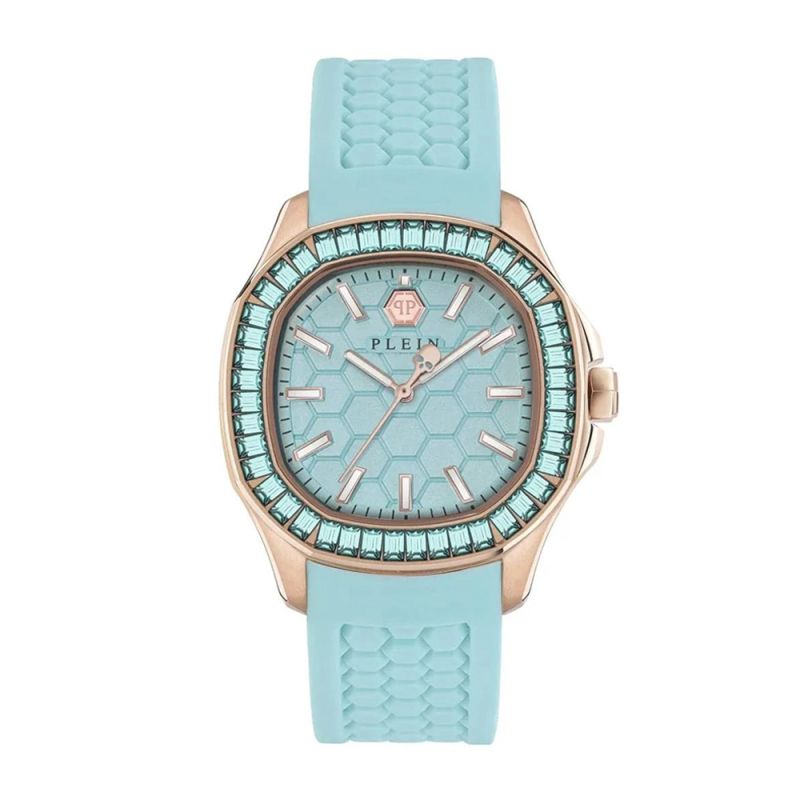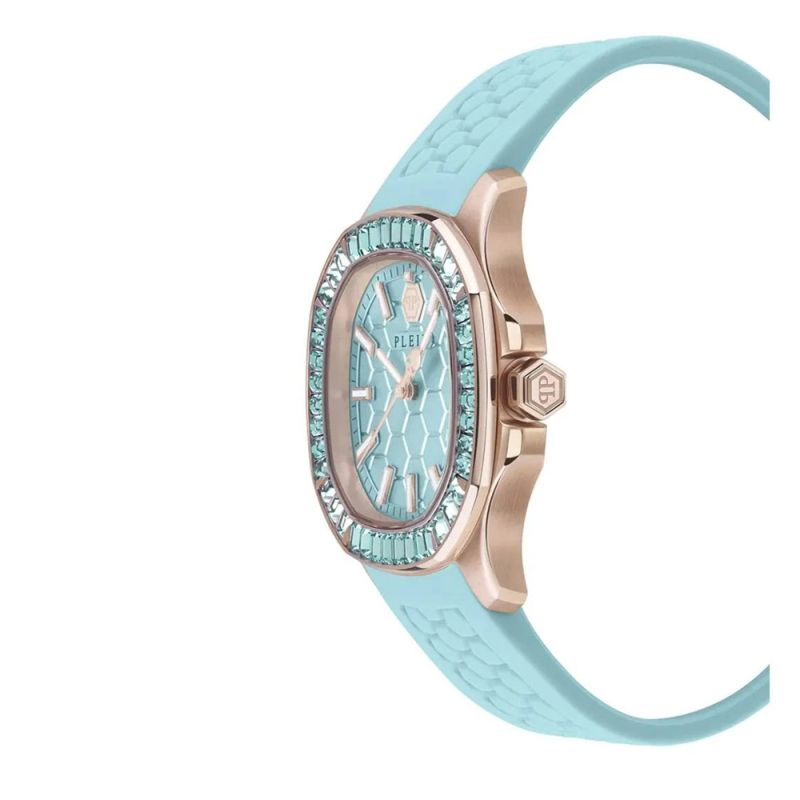 Дамски часовник Philipp Plein с модерен дизайн от колекция Spectre. Аналогов дисплей в тюркоазен цвят. Луминесцентно покритие върху стрелките и индексите. Корпус от неръждаема стомана съчетан със силиконова каишка. Безел украсен с нежни кристали. Стъкло минерал-кристал. Кварцов механизъм. Водоустойчивост 5 ATM - допускат се леки пръски и взимане на душ, не се препоръчва обилно мокрене.