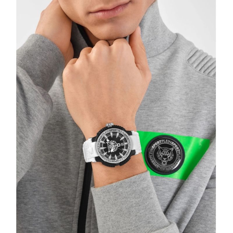 Унисекс часовник Philipp Plein с модерна спортна визия. Корпус изработен от неръждаема стомана. Диаметър на корпуса 45 мм. Бяла силиконова каишка. Моделът е с черен циферблат с характерното лого на колекцията Plein Sport и с показател за дата. Минерално стъкло, устойчиво към надраскване. Часовникът се задвижва от кварцов механизъм. Водоустойчивост 5 ATM - допускат се леки пръски и взимане на душ, не се препоръчва обилно мокрене.