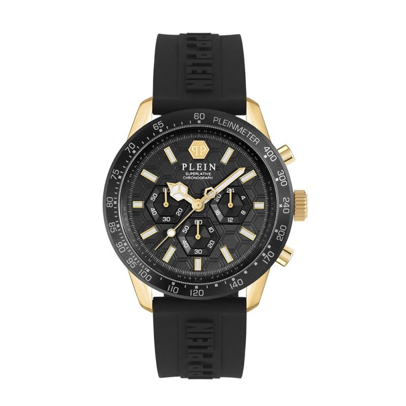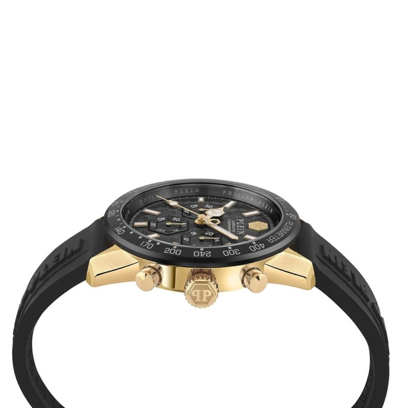 Мъжки часовник Philipp Plein с корпус от неръждаема стомана. Черна силиконова каишка. Стилен дисплей тип хронограф в черен цвят. Луминесцентно покрите върху стрилките и индексите. Стъкло минерал-кристал. Часовникът се задвижва от кварцов механизъм. Водоустойчивост 5 ATM - допускат се леки пръски и взимане на душ, не се препоръчва обилно мокрене.