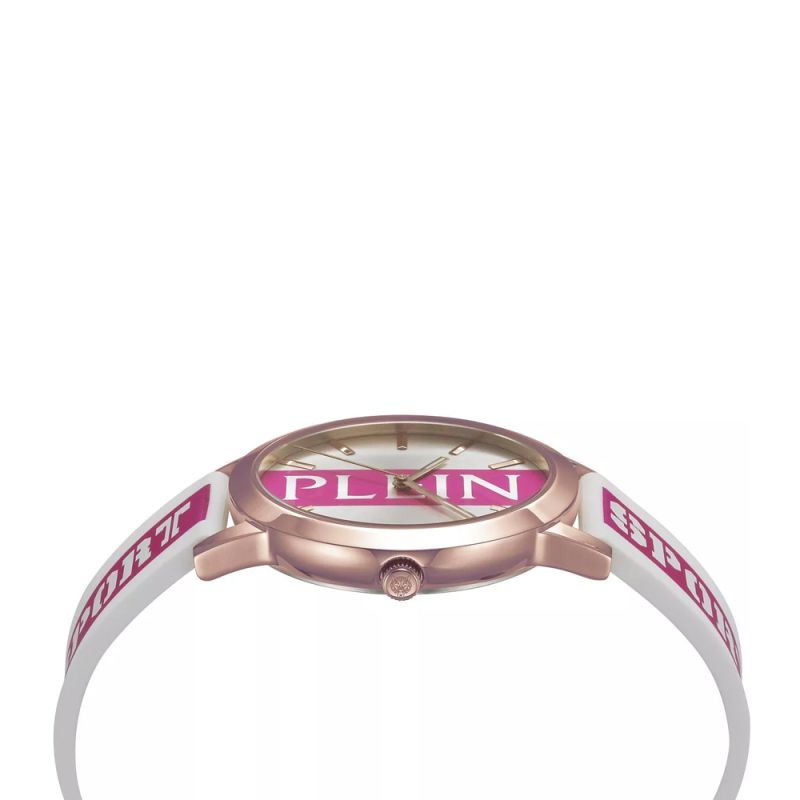 Дамски часовник Philipp Plein със спортно-елегантне дизайн. Корпусът е изработен от неръждаема стомана. Диаметър на корпуса 41 мм. Луминесцентно покритие върху стрелките. Силиконовата каишка и циферблатът са в красива комбинация между бял и розов цвят с логото на колекцията. Стъкло минерал-кристал. Часовникът се задвижва от кварцов механизъм. Водоустойчивост 5 ATM - допускат се леки пръски и взимане на душ, не се препоръчва обилно мокрене.