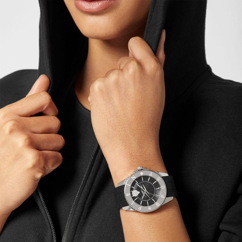 Спортен модел дамски часовник Philipp Plein с модерен дизайн. Корпус изработен от неръждаема стомана, съчетан със силиконова каишка. Черен циферблат с интересен дизайн, сребристи стрелки и индекси. Минерално стъкло, устойчиво към надраскване. Кварцов механизъм. Водоустойчивост 5 ATM - допускат се леки пръски и взимане на душ, не се препоръчва обилно мокрене.