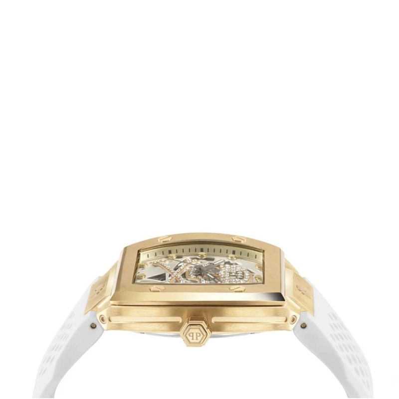 Мъжки часовник Philipp Plein от колекция The Skeleton. Циферблата е с атрактивен дизайн и отличителния за марката череп. Корпус изработен от неръждаема стомана. Бяла силиконова каишка. Минерално стъкло, устойчиво към надраскване. Автоматичен механизъм. Водоустойчивост 5 ATM - допускат се леки пръски и взимане на душ, не се препоръчва обилно мокрене.