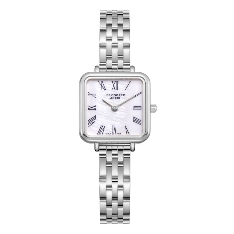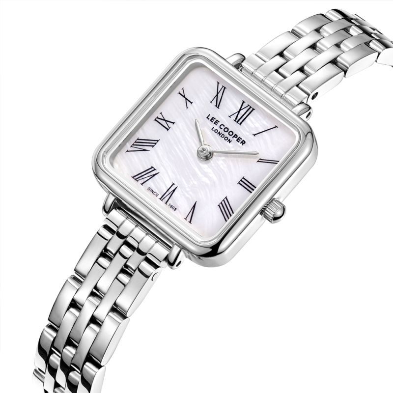 Класически модел дамски часовник Lee Cooper с изискана визия. Корпус изработен от супер метал. Верижка от неръждаема стомана. Аналогов дисплей в красив седефен цвят със сребристи стрелки и черни римски цифри. Стъкло минерал-кристал. Задвижва се от кварцов механизъм. Водоустойчивост 3 ATM - допускат се леки пръски, не се препоръчва обилно мокрене.