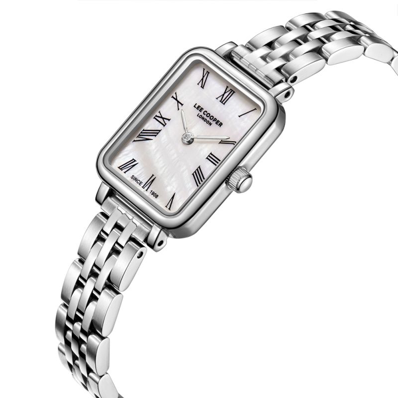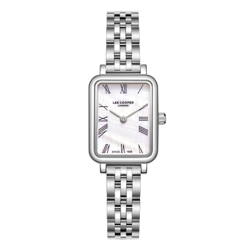 Класически модел дамски часовник Lee Cooper с изискана визия. Корпус изработен от супер метал. Верижка от неръждаема стомана. Аналогов дисплей в красив седефен цвят със сребристи стрелки и черни римски цифри. Стъкло минерал-кристал. Задвижва се от кварцов механизъм. Водоустойчивост 3 ATM - допускат се леки пръски, не се препоръчва обилно мокрене.