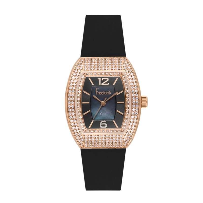 Модерен дамски часовник Freelook със спортно-елегантна визия от колекцията Charmant. Корпус изработен от неръждаема стомана. Черна силиконова каишка. Аналогов дисплей с вътрешна част от седеф. Декорация от нежни кристали по безела. Стъкло минерал-кристал. Задвижва се от кварцов механизъм с калибър VJ21C1. Водоустойчивост 5 ATM - допускат се леки пръски и взимане на душ, не се препоръчва обилно мокрене.