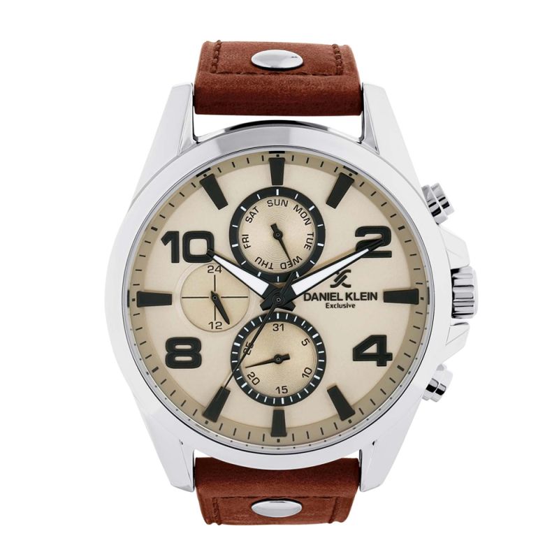 Стилен мъжки часовник Daniel Klein с мултифункционален дисплей от колекцията Exclusive. Стъкло минерал-кристал. Метален корпус. Каишка от естествена кожа. Задвижва се от кварцов механизъм. Водоустойчивост 5 ATM - допускат се леки пръски и взимане на душ, не се препоръчва обилно мокрене.