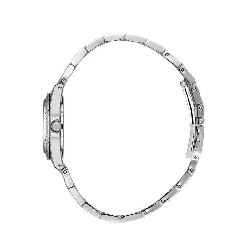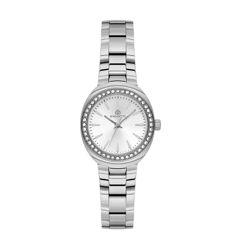 Дамски часовник Bigotti с класически дизайн от колекцията Raffinata. Моделът е с декорация от нежни кристали по безела. Аналогов дисплей в сребрист цвят. Стъкло минерал-кристал. Метален корпус в комбинация с верижка от неръждаема стомана. Задвижва се от кварцов механизъм калибър VJ21C1. Диаметър на корпус 33.5 мм с широчина на верижката 14 мм х 12 мм. Водоустойчивост 3 ATM - допускат се леки пръски, не се препоръчва обилно мокрене.