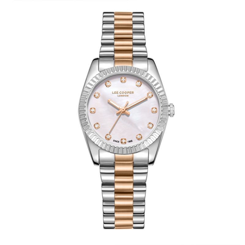 Елегантен дамски часовник Lee Cooper от колекцията Elegance. Корпус изработен от супер метал, съчетан с верижка от неръждаема стомана. Диаметър на корпуса 30 мм. Аналогов дисплей в красив седефен цвят със стрелки в цвят розово злато и нежни кристали по индексите. Стъкло минерал-кристал. Задвижва се от кварцов механизъм. Водоустойчивост 3 ATM - допускат се леки пръски, не се препоръчва обилно мокрене.