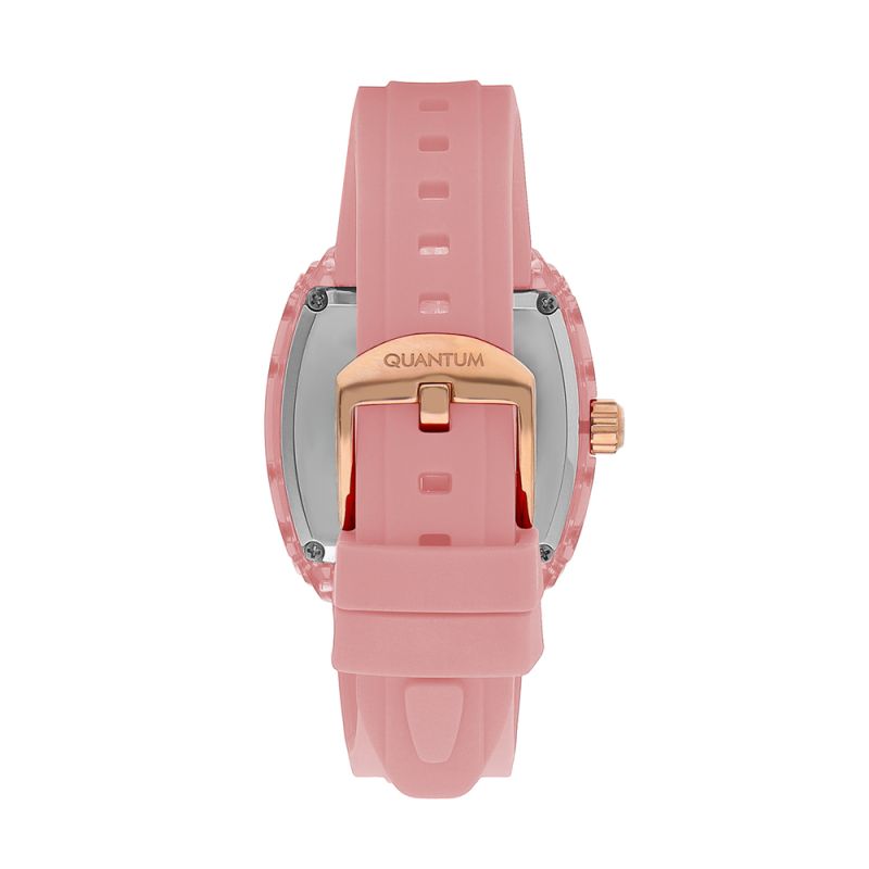 Дамски часовник Quantum с модерна спортна визия в нежен розов цвят. Мултифункционален дисплей с показатели за дата, ден от седмицата и 24-часов формат. Стъкло минерал-кристал. Моделът е с корпус от полимер и силиконова каишка. Часовникът се задвижва от кварцов механизъм. Водоустойчивост 5 ATM - допускат се леки пръски и взимане на душ, не се препоръчва обилно мокрене.