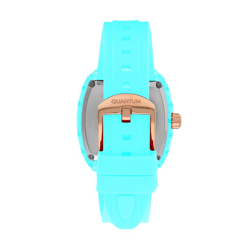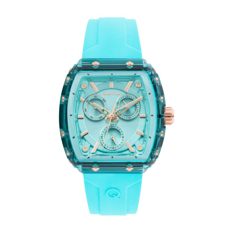 Дамски часовник Quantum с модерна спортна визия в прекрасен син цвят. Мултифункционален дисплей с показатели за дата, ден от седмицата и 24-часов формат. Стъкло минерал-кристал. Моделът е с корпус от полимер и силиконова каишка. Часовникът се задвижва от кварцов механизъм. Водоустойчивост 5 ATM - допускат се леки пръски и взимане на душ, не се препоръчва обилно мокрене.