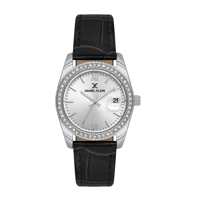 Стилен дамски часовник Daniel Klein с красив дизайн от колекцията Premium. Сребрист аналогов дисплей с показател за дата. Декорация от нежни кристали по безела. Метален корпус. Диаметър на корпуса 37.5 мм. Черна каишка от естествена кожа. Стъкло минерал-кристал. Задвижва се от кварцов механизъм VX12E11. Водоустойчивост 3 ATM - допускат се леки пръски, не се препоръчва обилно мокрене.