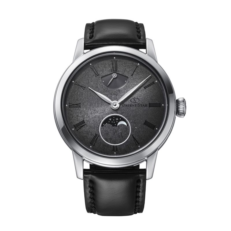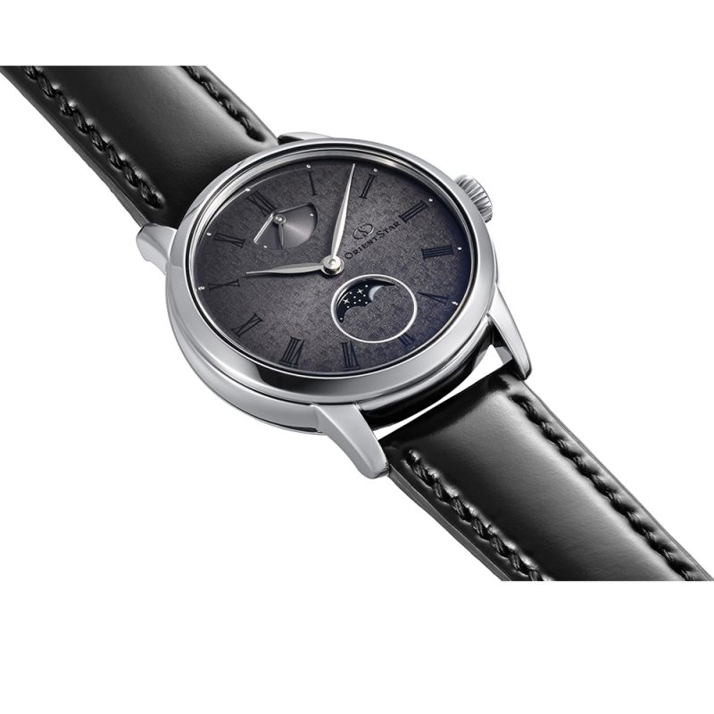 Стилен мъжки часовник Orient Star от колекцията M-Collection /M45 F8/ Skeleton hand winding. Циферблат с минималистичен дизайн, изразяващ темата за „грациозно течение на времето“ и разполагащ с индикатор за резервна мощност и дисплей за лунните фази. Корпусът е изработен от неръждаема стомана и е съчетан с каишка от естествена кожа. Стъклото е сапфирено със супер антрирефлексно покритие. Автоматичен механизъм F8A62 с резервна мощност 70 часа и 20 камъка. През прозрачния гръб на корпуса може да се наблюдава механизма на часовника. Водоустойчивост 5 ATM - допускат се леки пръски и взимане на душ, не се препоръчва обилно мокрене.