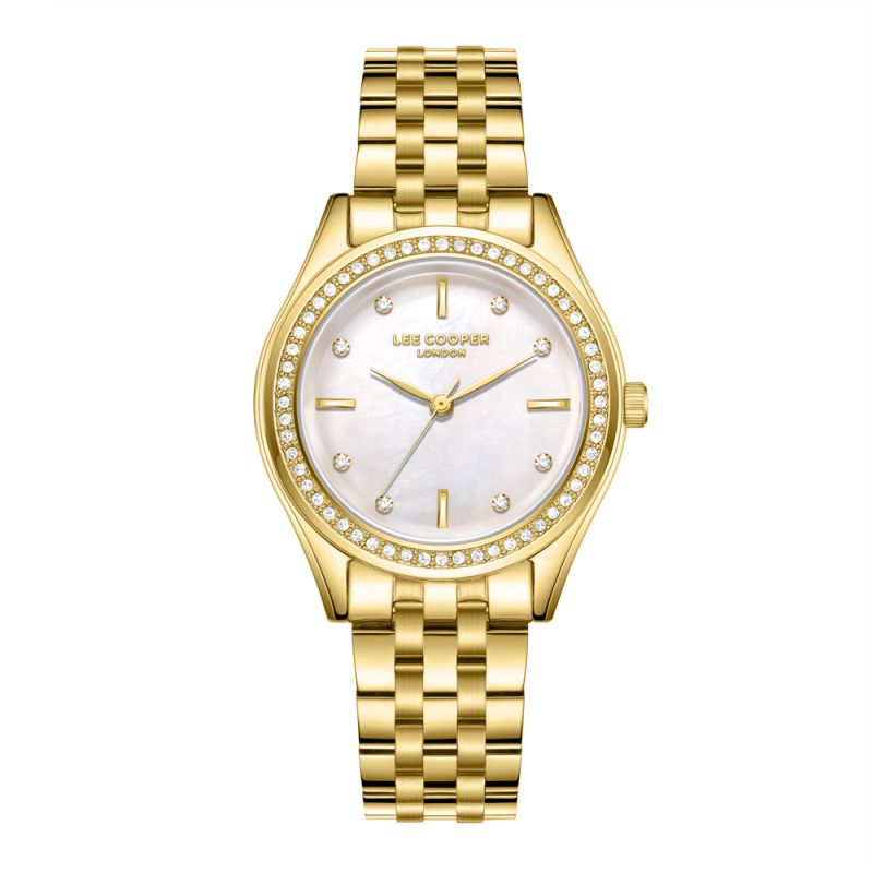 Стилен дамски часовник Lee Cooper от колекцията Elegance. Моделът е с декорация от нежни кристали по безела и дисплея. Корпус изработен от супер метал. Верижка от неръждаема стомана. Диаметър на корпуса 33 мм. Аналогов дисплей в седефен цвят. Стъкло минерал-кристал. Задвижва се от кварцов механизъм. Водоустойчивост 3 ATM - допускат се леки пръски, не се препоръчва обилно мокрене.