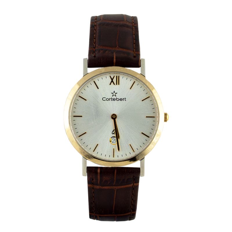 Класически модел мъжки часовник Cortebert със стилен дизайн. Корпус от неръждаема стомана. Кафява каишка от естествена кожа. Сребрист аналогов дисплей с показател за дата, златисти стрелки и индекси. Стъкло минерал-кристал. Задвижва се от кварцов механизъм. Водоустойчивост 3 ATM - допускат се леки пръски, не се препоръчва обилно мокрене.