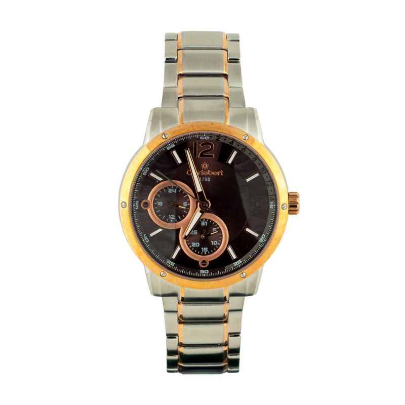 Мъжки часовник Cortebert със спортно-елегантен дизайн. Тъмнокафяв мултифункционален дисплей с детайли в цвят розово злато, луминисцентни стрелки и индекси. Корпус и верижка изработени от неръждаема стомана. Стъкло минерал-кристал. Задвижва се от кварцов механизъм. Водоустойчивост 3 ATM - допускат се леки пръски, не се препоръчва обилно мокрене.
