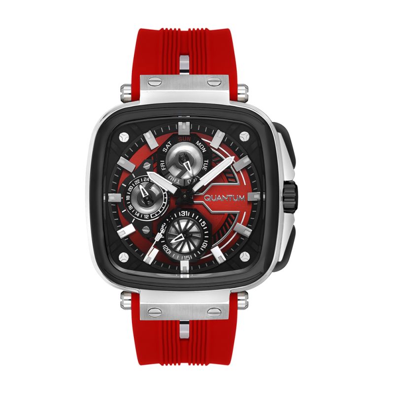 Мъжки часовник Quantum с впечатляващ дизайн. Моделът е с мултифункционален дисплей. Луминесцентно покритие върху стрелките и индексите. Стъкло минерал-кристал с антирефлексно покритие. Корпус от неръждаема стомана в комбинация със силиконова каишка. Задвижва се от кварцов механизъм. Водоустойчивост 10 ATM - позволява мокрене, къпане и плуване във водни басейни.