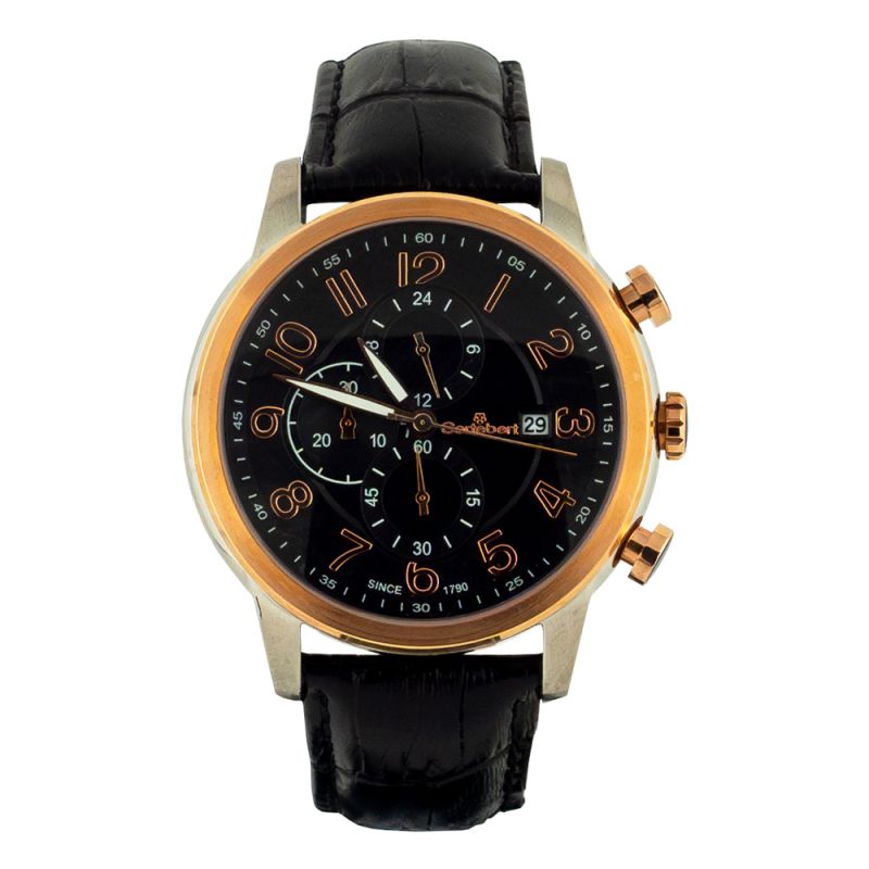 Мъжки часовник Cortebert със стилна визия. Корпус изработен от неръждаема стомана в комбинация с каишка от естествена кожа. Черен дисплей тип хронограф с луминисцентни стрелки и детайли в цвят розово злато. Стъкло минерал-кристал. Задвижва се от кварцов механизъм. Водоустойчивост 3 ATM - допускат се леки пръски, не се препоръчва обилно мокрене.
