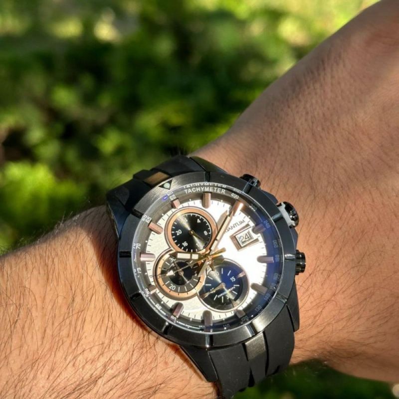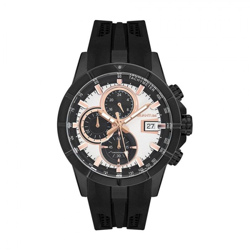 Мъжки часовник Quantum със спортен дизайн. Дисплей тип хронограф. Стъкло минерал-кристал. Корпус от неръждаема стомана. Черна силиконова каишка. Диаметър на корпуса 47 мм. Задвижва се от кварцов механизъм с калибър VR33B21. Водоустойчивост 10 ATM - позволява мокрене, къпане и плуване във водни басейни.
