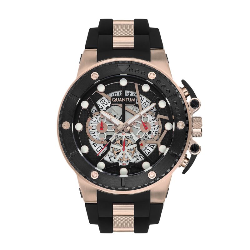Страхотен модел мъжки часовник Quantum от колекцията Hunter. Дисплей комбинация от хронограф и скелетон с впечатляващ дизайн. Луминесцентно покритие върху стрелките и индексите. Стъкло минерал-кристал с антирефлексно покритие. Корпус от неръждаема стомана в комбинация със силиконова каишка. Диаметър на корпуса 50 мм. Часовникът се задвижва от кварцов механизъм. Водоустойчивост 10 ATM - позволява мокрене, къпане и плуване във водни басейни.