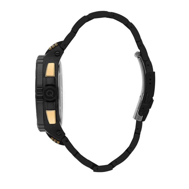 Спортно-елегантен мъжки часовник Quantum. Дисплей тип хронограф в черен цвят със златисти детайли. Стъкло минерал-кристал с антирефлексно покритие. Корпус и верижка от неръждаема стомана. Диаметър на корпуса 48 мм. Задвижва се от кварцов механизъм. Водоустойчивост 10 ATM - позволява мокрене, къпане и плуване във водни басейни.