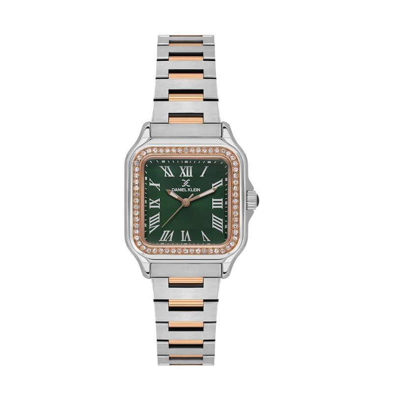 Дамски часовник Daniel Klein с елегантен дизайн от колекцията Premium. Моделът е с декорация от инкрустирани кристали по безела. Аналогов дисплей в зелен цвят. Метален корпус в комбинация с верижка от неръждаема стомана. Стъкло минерал-кристал. Задвижва се от кварцов механизъм 2035. Водоустойчивост 3 ATM - допускат се леки пръски, не се препоръчва обилно мокрене.
