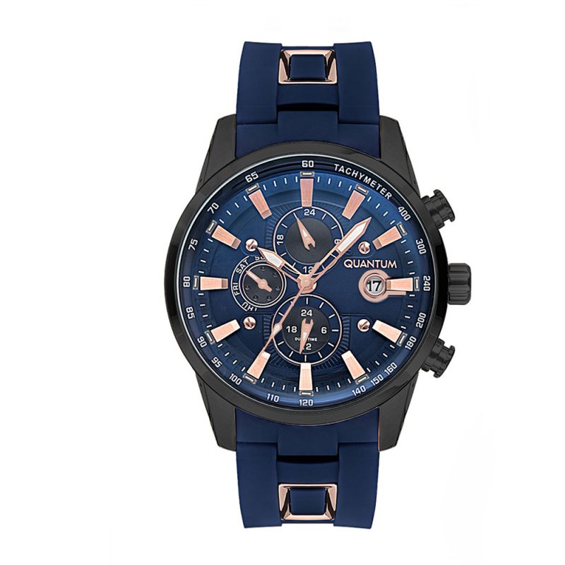 Мъжки часовник Quantum със спортен дизайн от колекцията Adrenaline. Син мултифункционален дисплей с детайли в цвят розово злато. Луминесцентно покритие върху стрелките. Стъкло минерал-кристал с антирефлексно покритие. Корпус  изработен от неръждаема стомана. Синя силиконова каишка. Задвижва се от кварцов механизъм. Водоустойчивост 10 ATM - позволява мокрене, къпане и плуване във водни басейни.