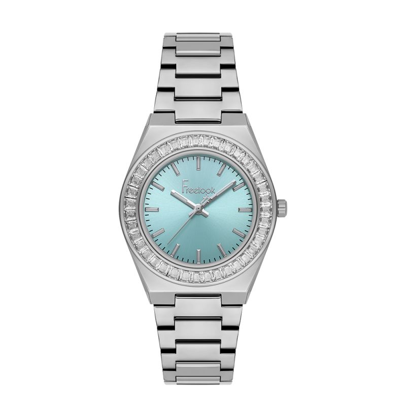 Дамски часовник Freelook FL.1.10502-3 от колекцията Charmant се отличава с класически дизайн, модерна визия и красива декорация от кристали по безела. Корпусът и верижката са изработени от неръждаема стомана. Стъклото е минерал-кристал. Дисплеят е аналогов в нежен син цвят. Диаметър на корпуса 34 мм. Часовникът се задвижва от кварцов механизъм. Водоустойчивост 5 ATM - допускат се леки пръски и взимане на душ, не се препоръчва обилно мокрене.