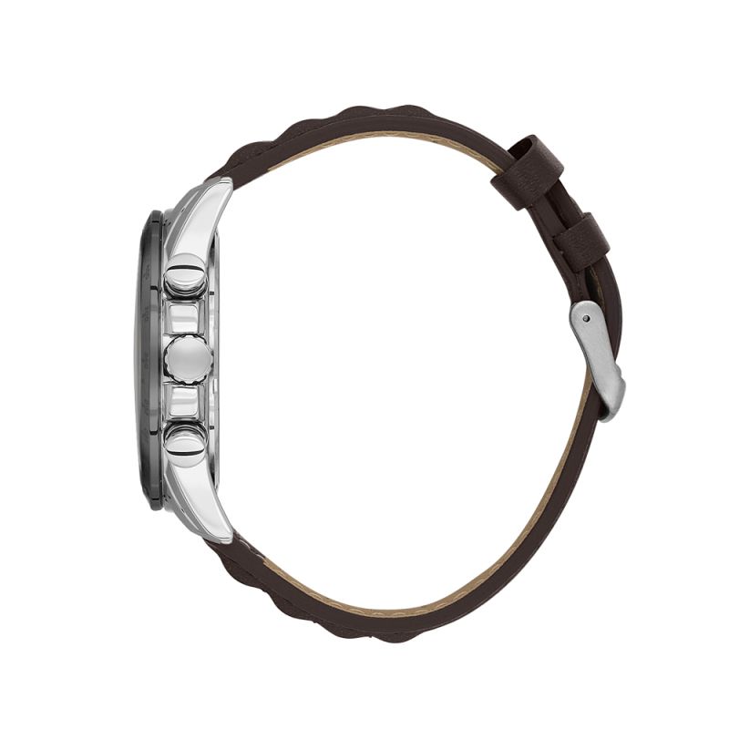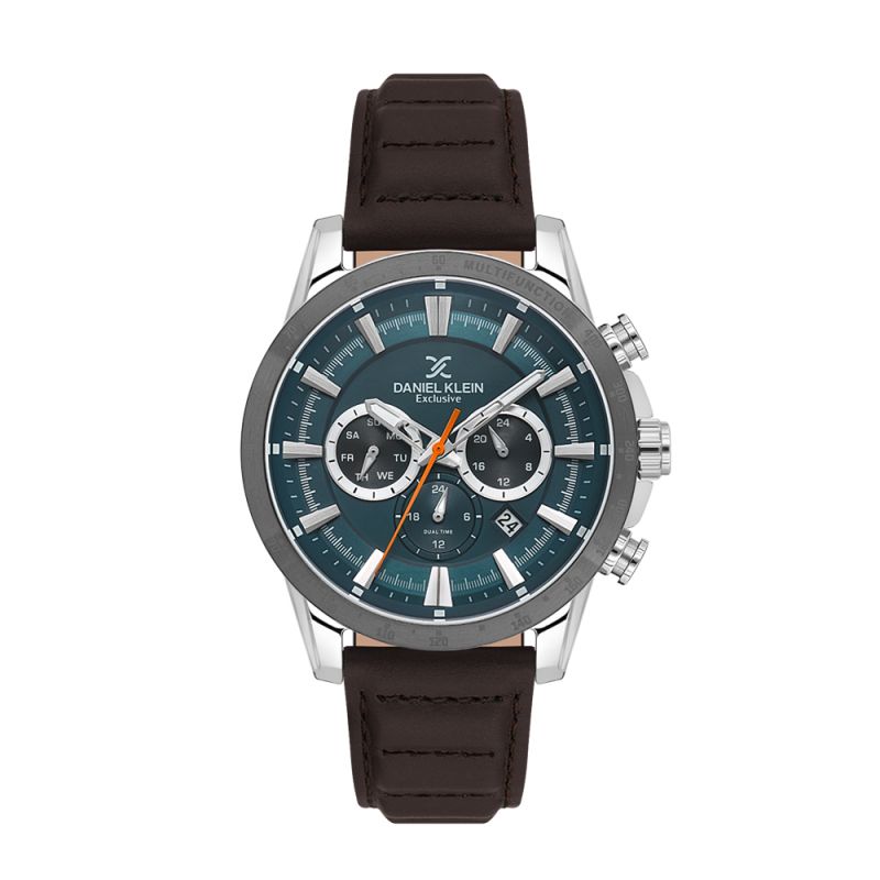 Стилен мъжки часовник Daniel Klein от колекцията Exclusive. Мултифункционален дисплей с показатели за дата, ден от седмицата и двойно време. Корпус изработен от метал. Тъмнокафява каишка от естествена кожа. Стъкло минерал-кристал. Диаметър на корпуса 45 мм. Часовникът се задвижва от кварцов механизъм JP25-4.5. Водоустойчивост 5 ATM - допускат се леки пръски и взимане на душ, не се препоръчва обилно мокрене.