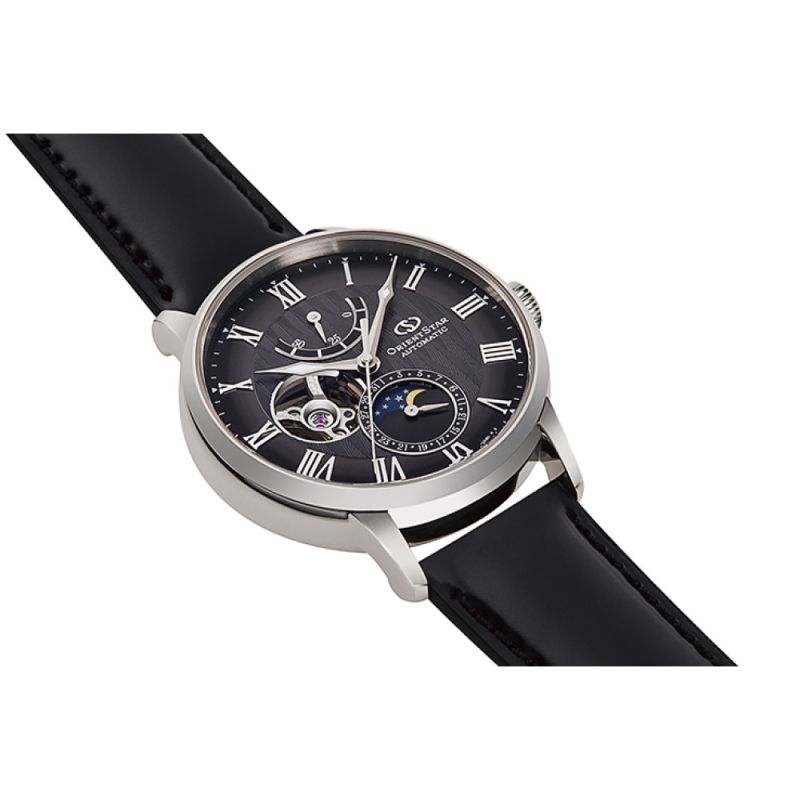 Мъжки часовник Orient Star от колекцията M-Collection /M45 F7/ Mechanical Moon Phase. Корпусът е от неръждаема стомана и е съчетан с черна каишка от естествена кожа. Моделът е с интересен мотив, наподобяващ течаща вода върху циферблата. Цветовата градация придава на циферблата привлекателен контраст и усещане за дълбочина. Часовникът е с отвор, позволяващ да се наблюдава част от механизма, индикатор за резервната мощност, индикатор за лунна фаза и дата. Сапфирено стъкло с антрирефлексно покритие. Автоматичен японски механизъм F7M62 с резервна мощност 50 часа и 22 камъка. Водоустойчивост 5 ATM - допускат се леки пръски и взимане на душ, не се препоръчва обилно мокрене.