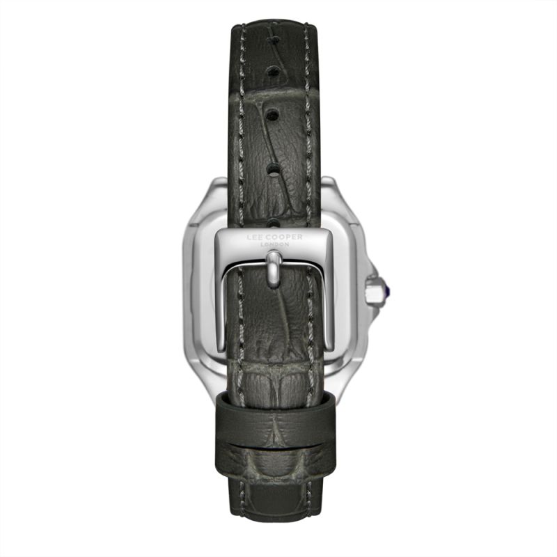Класически модел дамски часовник Lee Cooper със стилен дизайн. Бял аналогов дисплей със сини стрелки и римски цифри в черен цвят. Стъкло минерал-кристал. Корпус изработен от супер метал - специална сплав, създадена от марката. Тъмносива каишка от естествена кожа. Задвижва се от кварцов механизъм. Водоустойчивост 3 ATM - допускат се леки пръски, не се препоръчва обилно мокрене.