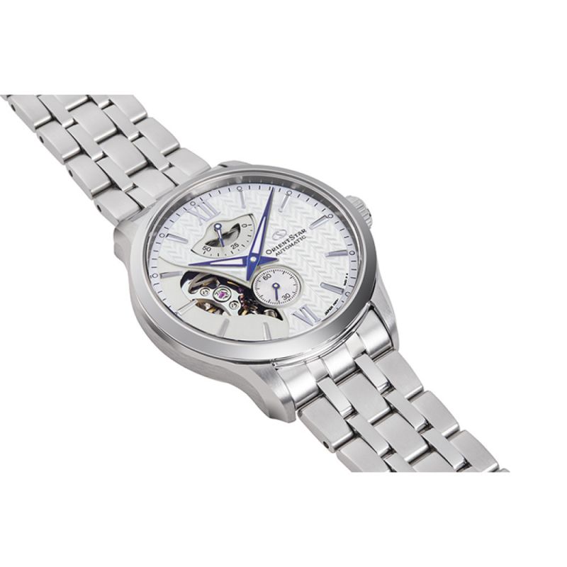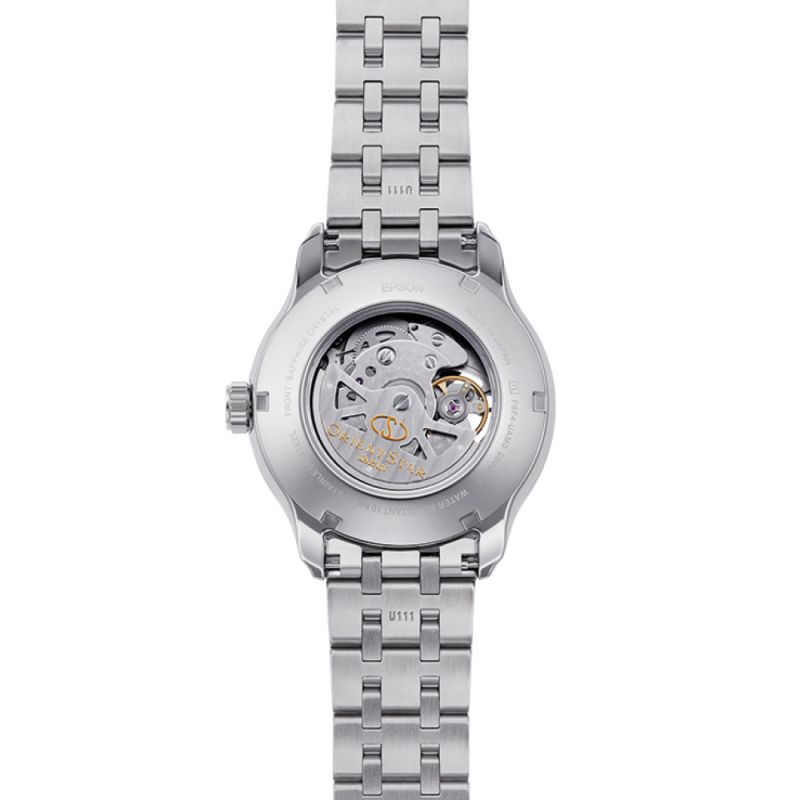 Класически модел мъжки часовник Orient Star с елегантен дизайн. Моделът е с полу-скелетонизиран дисплей с видим баланс, индикатор за резервна мощност и отделен секундарник. Корпусът и верижката са изработени от неръждаема стомана. Стъклото е сапфир-кристал. Часовникът се задвижва от японски автоматичен механизъм F6F44 с 24 камъка и 50 часа резервна мощност. Водоустойчивост 10 ATM - позволява мокрене, къпане и плуване във водни басейни.