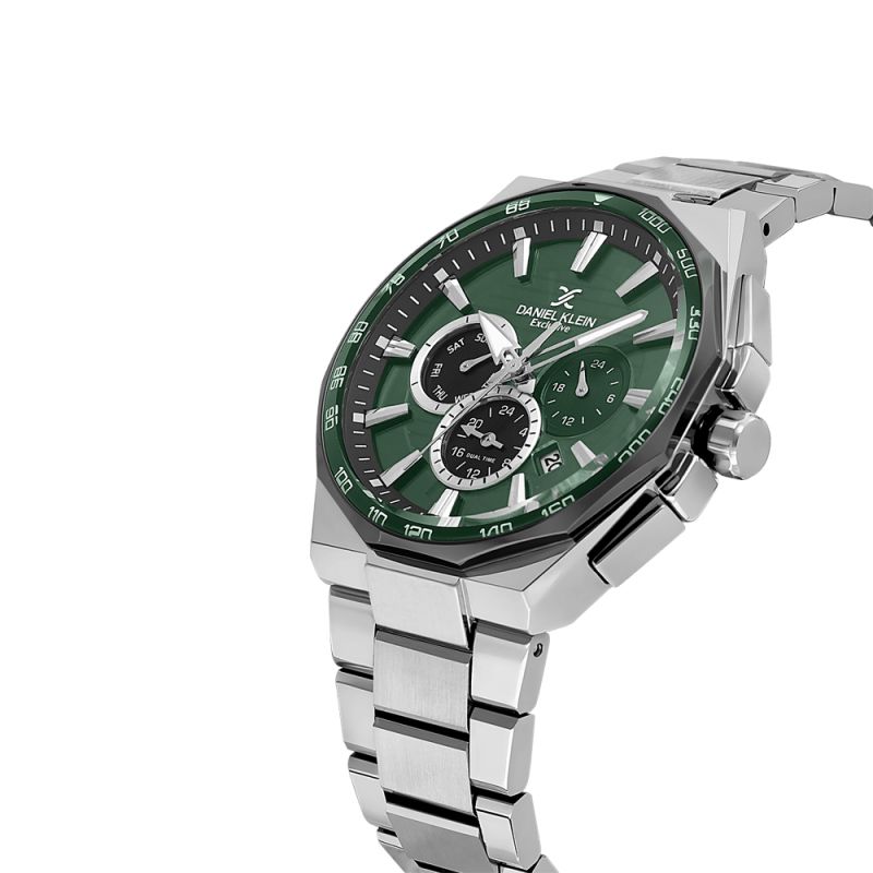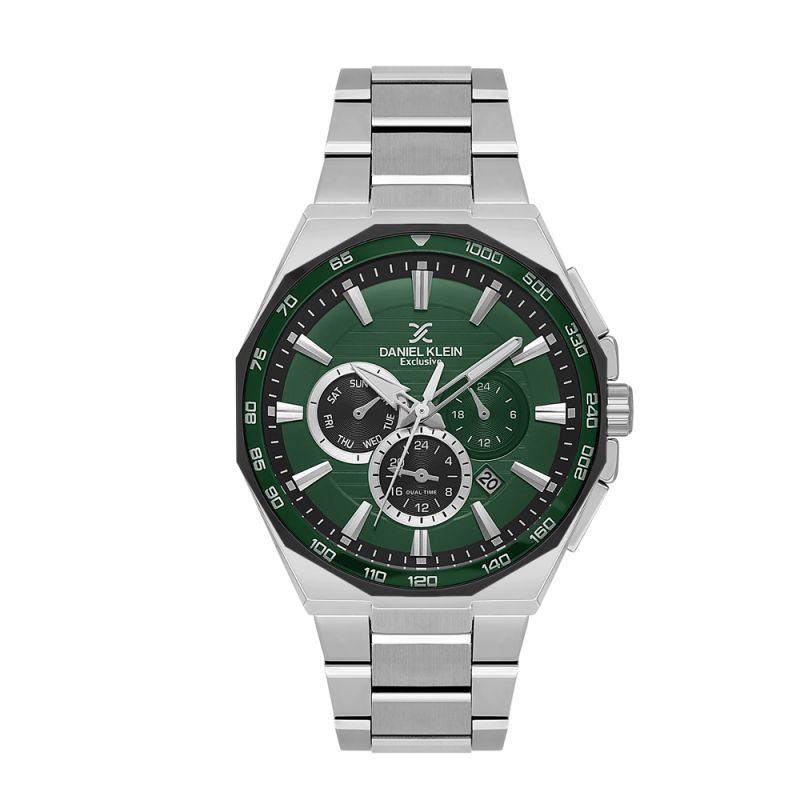Мъжки часовник Daniel Klein със спортно-елегантен дизайн от колекцията Exclusive. Моделът е с метален корпус и верижка от неръждаема стомана. Диаметър на корпуса 44.5 мм. Мултифункционален дисплей с показатели за дата, ден от седмицата и двойно време. Стъкло минерал-кристал. Часовникът се задвижва от кварцов механизъм JP25-4.5. Водоустойчивост 5 ATM - допускат се леки пръски и взимане на душ, не се препоръчва обилно мокрене.