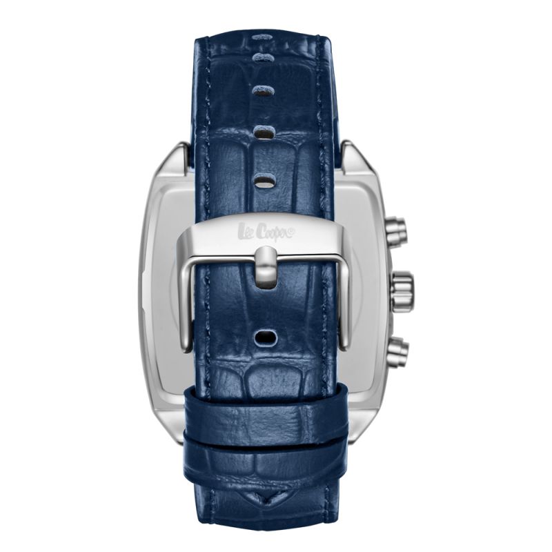 Стилен мъжки часовник Lee Cooper. Мултифункционален дисплей в тъмносин цвят със сребристи детайли, показатели за дата, ден от седмицата, 24-часов формат и двойно време. Стъкло минерал-кристал. Корпус от супер метал - специална сплав, създадена от марката. Каишка от естествена кожа. Задвижва се от кварцов механизъм. Водоустойчивост 5 ATM - допускат се леки пръски и взимане на душ, не се препоръчва обилно мокрене.