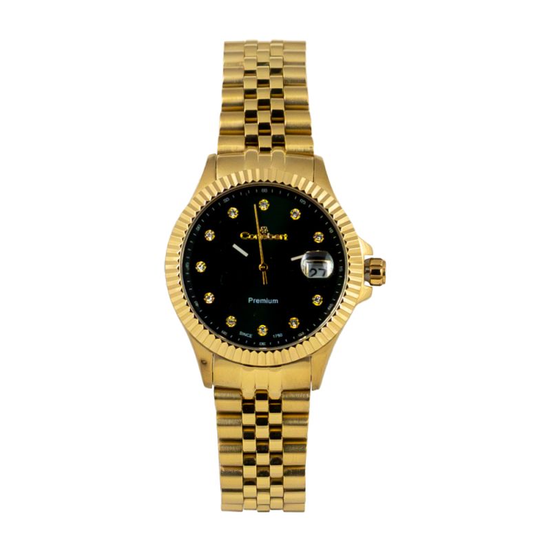 Класически модел дамски часовник Cortebert със стилен дизайн. Корпус и верижка изработени от неръждаема стомана. Тъмнозелен аналогов дисплей със златисти детайли, показател за дата и декорация от нежни цирконии. Стъкло минерал-кристал. Кварцов механизъм. Водоустойчивост 3 ATM - допускат се леки пръски, не се препоръчва обилно мокрене.