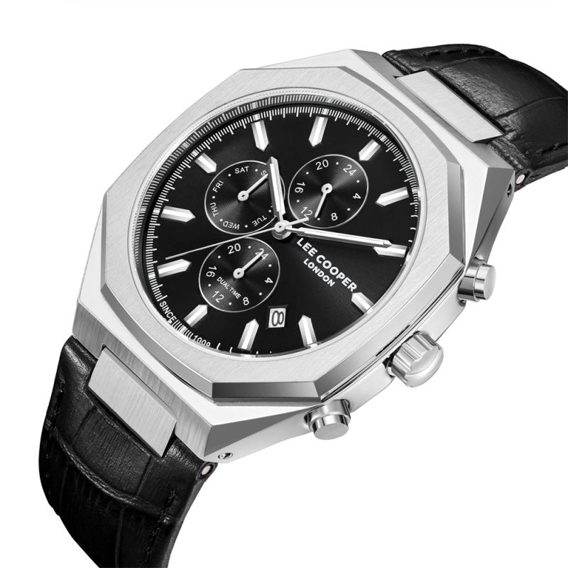 Мъжки часовник Lee Cooper със спортно-елегантен дизайн. Черен мултифункционален дисплей със сребристи детайли. Показатели за дата, ден от седмицата, 24-часов формат и двойно време. Луминесцентно покритие върху стрелките и индексите. Стъкло минерал-кристал. Корпус от супер метал - специална сплав, създадена от марката. Черна каишка от естествена кожа. Задвижва се от кварцов механизъм. Водоустойчивост 5 ATM - допускат се леки пръски и взимане на душ, не се препоръчва обилно мокрене.