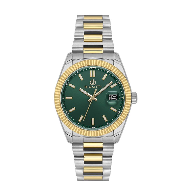 Мъжки часовник Bigotti с класически дизайн от колекцията Quotidiano. Моделът е с кропус от месинг и верижка от неръждаема стомана. Аналогов дисплей в тъмнозелен цвят с показател за дата. Луминисцентно покритие върху стрелките и индексите. Стъкло минерал-кристал. Диаметър на корпуса 41 мм. Часовникът се задвижва от кварцов механизъм с калибър 2315-3. Водоустойчивост 5 ATM - допускат се леки пръски и взимане на душ, не се препоръчва обилно мокрене.